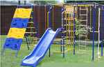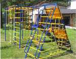 Большой спортивно-игровой комплекс станет украшением просторного подворья или многоквартирного двора. Спортивные снаряды в нем сочетаются с игровыми элементами: качели-лодочка, качели-гнездо, которые приведут в восторг детей и взрослых, скалодром, башня, две сетки для лазанья разной формы. "Радуга Плюс" покрыта безопасной порошковой краской, которая не выгорает и не боится непогоды. Конструкция выдерживает большую нагрузку. Установка производится на ровной лужайке, бетонируются несущие опоры (около 30 см).